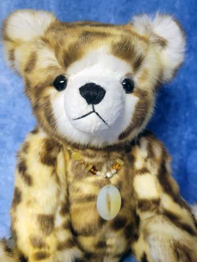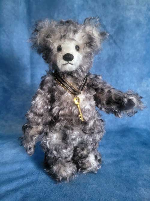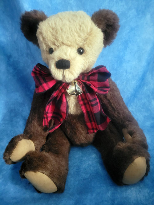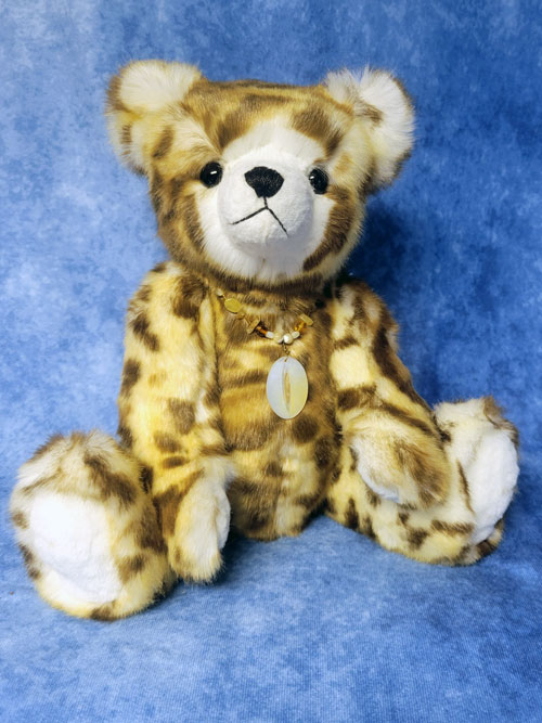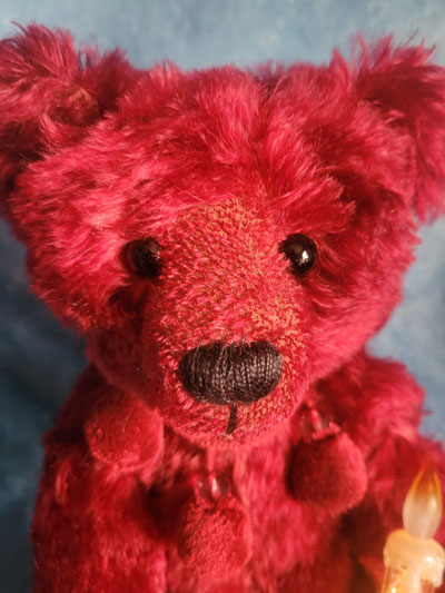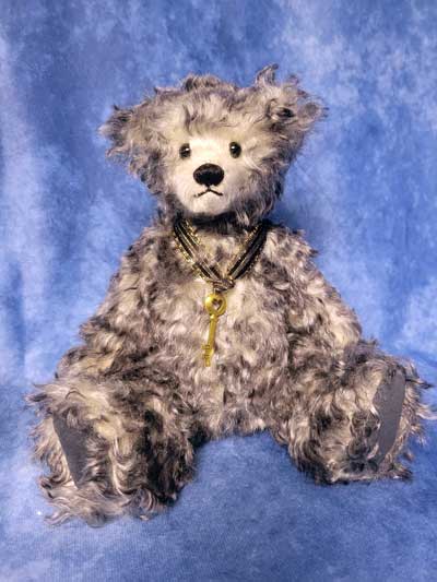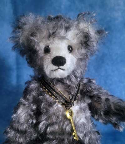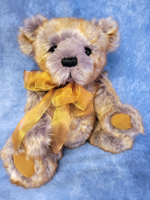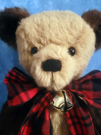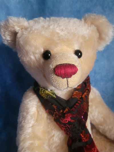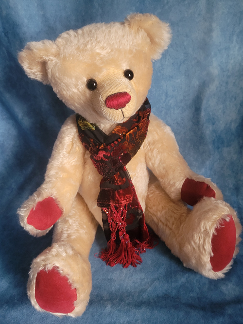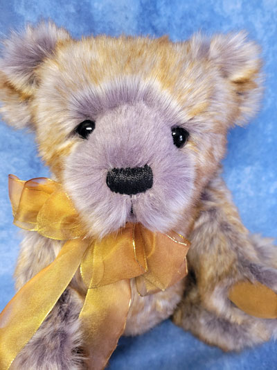 Rothchild is a 5-way jointed Tissavel bear. He has shaven Tissavel muzzle and paw pads, glass eyes, pearl cotton nose and mouth. Rothchild is stuffed with a combination of polyfil and glass bead for weight. |