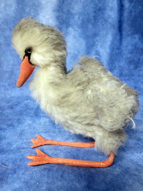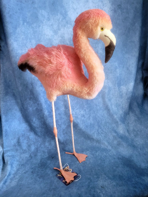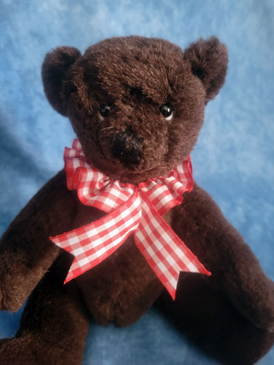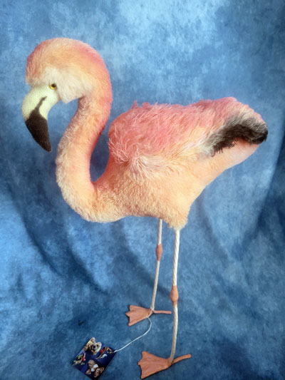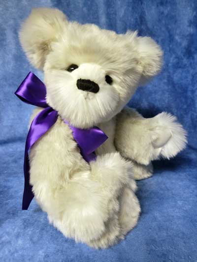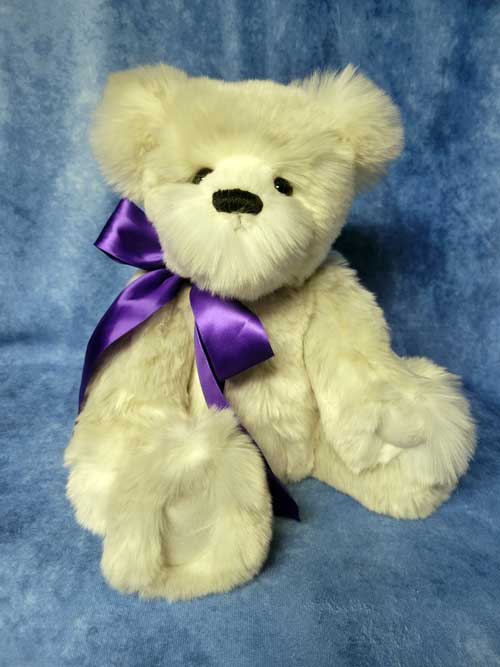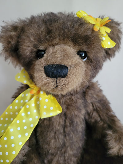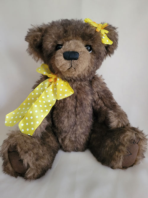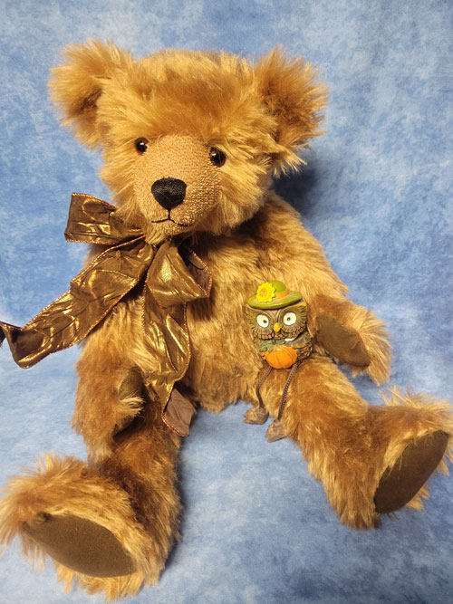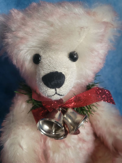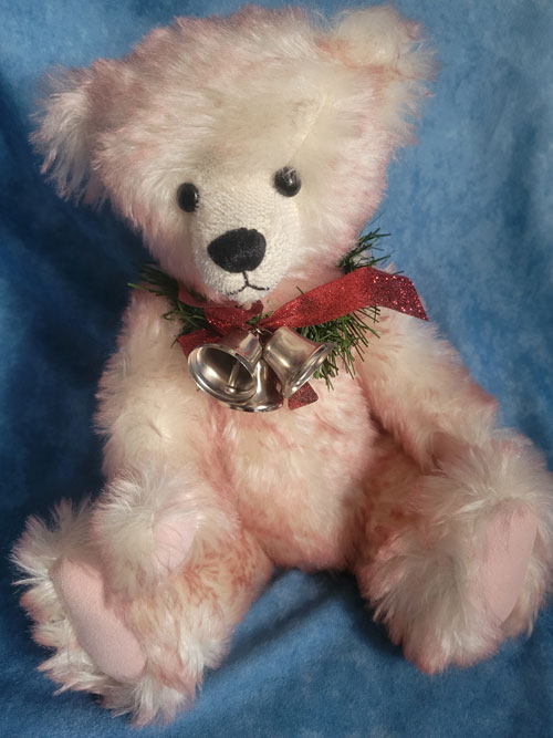 Rothchild is a 5-way jointed Tissavel bear. He has shaven Tissavel muzzle and paw pads, glass eyes, pearl cotton nose and mouth. Rothchild is stuffed with a combination of polyfil and glass bead for weight. |