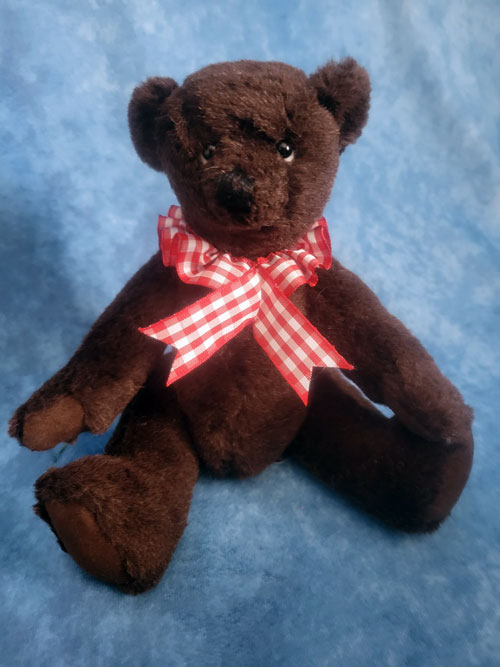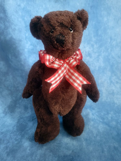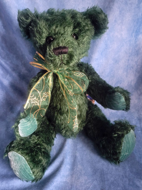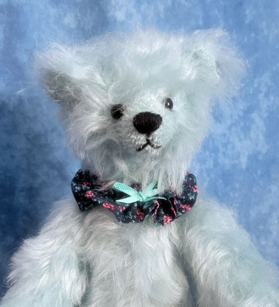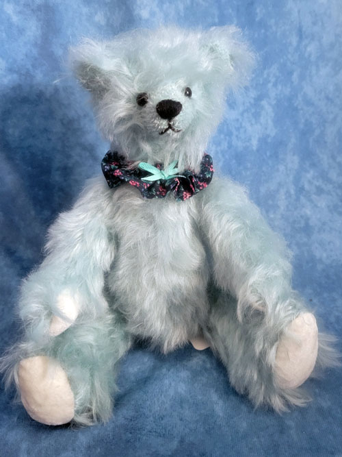 "Robin"10 inch Robin is a fully jointed mohair bear with ultrasuede paw pads. She has glass eyes and a hand stitched pearl cotton nose and mouth. Robin is stuffed with a combination of polyfil and glass for weight. |