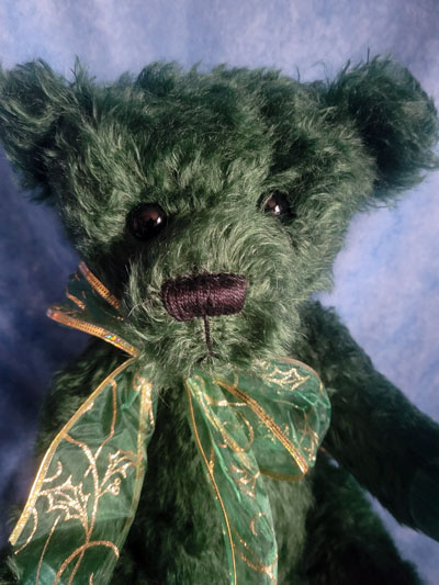 "Ryan"7 inch Ryan is a fully jointed 7 inch mohair bear with ultrasuede paw pads. He has glass eyes and hand stitched pearl cotton nose. He wears his handmade vest. |